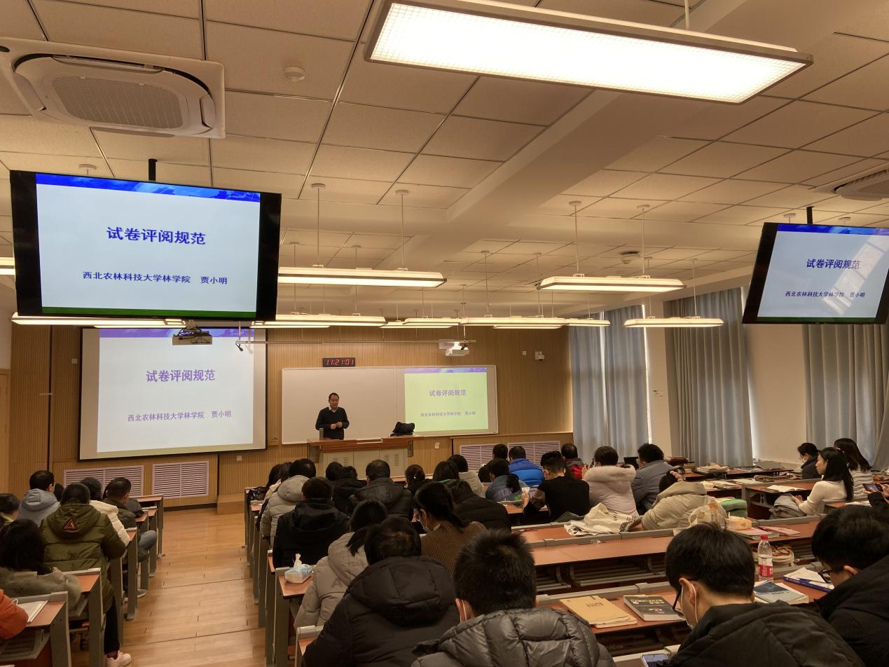 贾小明就我院期末考试的总体安排、主监考职责及监考规则、主监考注意事项、学生违纪作弊防范与处理等方面进行了详细解读,并对新一轮本科教育教学审核评估自评阶段发现的阅卷不规范问题做了试卷评阅规范培训,结合具体阅卷案例,就批阅标识、得扣分依据及标注、误阅更改、试卷分析等做了统一要求。